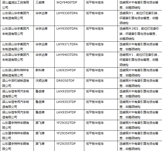 值得一提的是,此次公布的49款不符合《公告》的低平板半挂车产品中,有31款是来自山东省的生产企业。