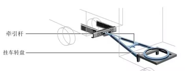 中置轴挂车牵引杆与挂车设计为一体,并且与车架下方额外安装的牵引销相连接。因其特殊的平衡结构,中置轴挂车与主车配合行驶时,主车也需承担较小的挂车重量,但《GB/T3730.1-2001》中提到负载重量不大于10%或1000N。中置轴挂车没有安装转向系统,并且牵引杆和挂车是刚性连接,使得其主挂车的连接方式与半挂车大致相同。